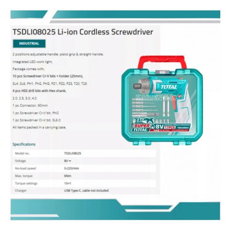 Total Destornillador Atornillador Inalámbrico 8v + 17 Acc Tsdli08025
